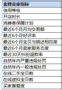 试运营期金牌卖家的考核指标分为:基本考核维度和行业动态服务标准两部分。基本考核维度有:信用等级丶开店时长丶交易额丶好评率丶宝贝与描述相符度丶卖家服务态度丶纠纷退款率丶买家喜爱度等。